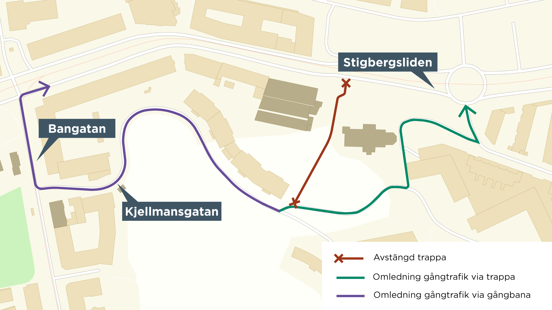 Se karta för information om hur du tar du dig fram mellan mellan Stigbergsliden och Kjellbergsgatan under byggtiden.