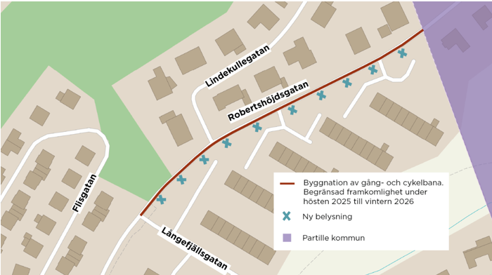Under höst och vinter 2025/2026 fortsätter vi att bygga ut gång- och cykelbana (GC) i området, syftet är att skapa en tryggare och säkrare miljö. I arbetet ingår att vi breddar befintlig gångbana för att ge plats åt en ny GC längs Robertshöjdsgatan med farthinder vid övergångsstället.