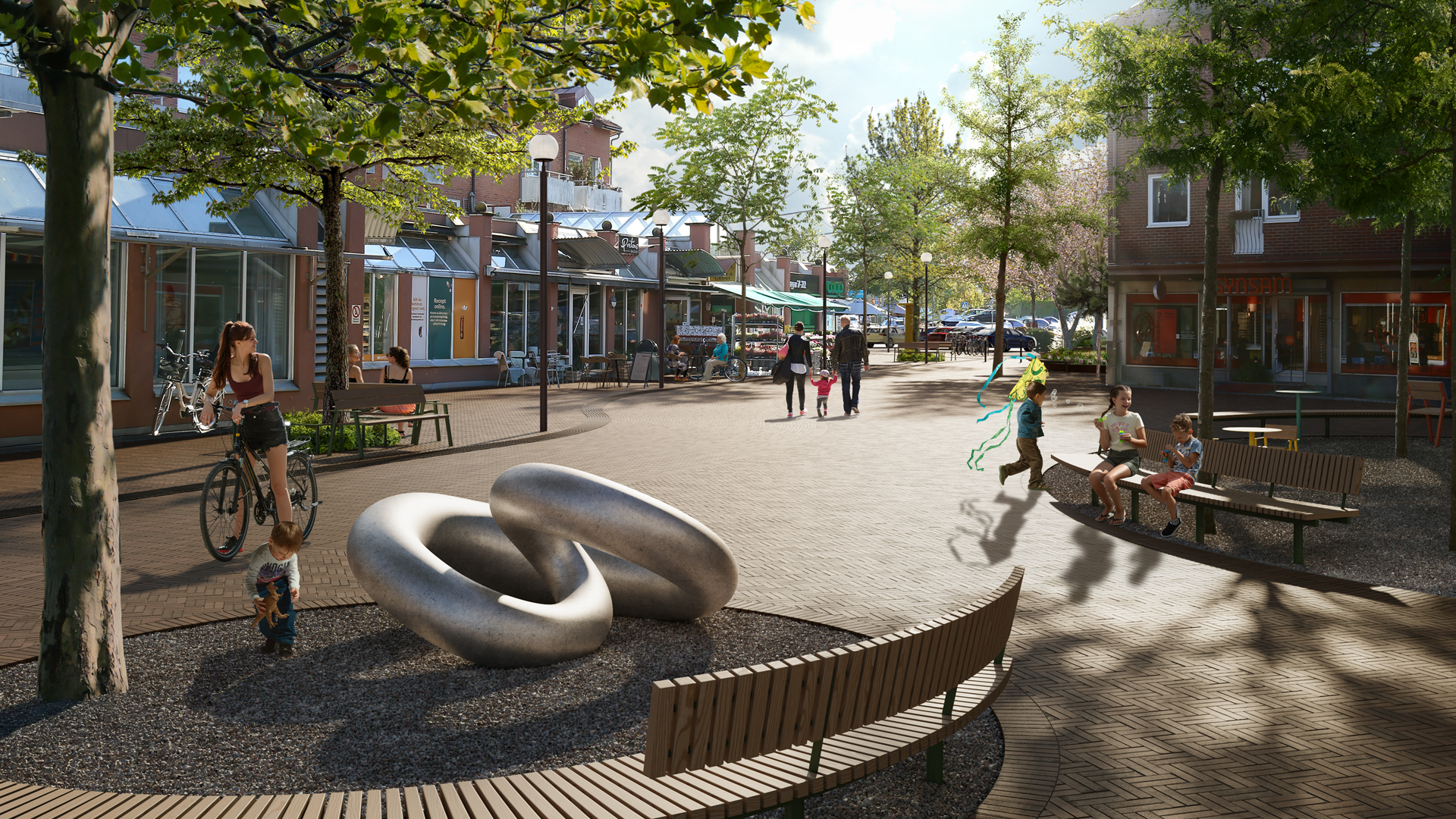 Munkebäckstorget med ny stenläggning, sittplatser och lekskulptur. Visualisering: Sweco