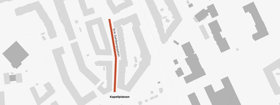 Erik Dahlbergsgatan stängs av för fordonstrafik mellan Kapellplatsen och Erik Dahlbergstrappan. Gående hänvisas till den västra sidan av Erik Dahlbergsgatan. Gällande boende på östra sidan är entréer tillgängliga.