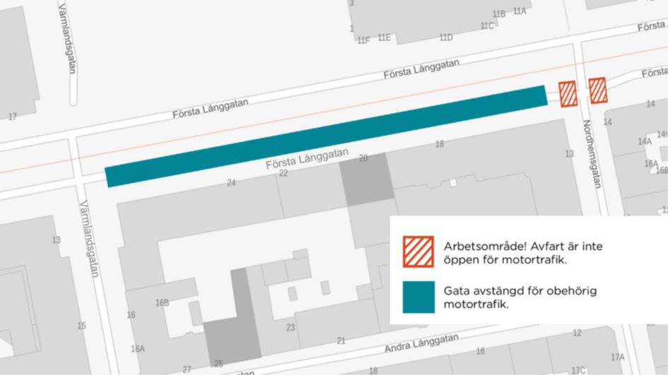 Motortrafik kan därmed inte köra österut i Första Långgatan mellan Värmlandsgatan och Nordhemsgatan. Transport- och sopbilar till de berörda fastigheterna längsmed avstängningen kommer släppas in med flaggvakt, och vända i gata för att åter köra ut mot Värmlandsgatan. Väg för gång- och cykeltrafik är fortsatt framkomlig.