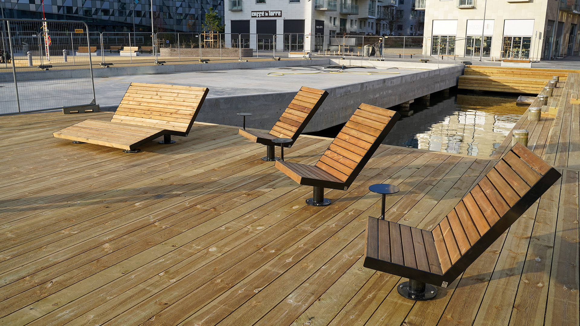 På torget och bryggdäcket finns olika typer av sittplatser: traditionella parkbänkar, solstolar, snurrfåtöljer och avsatser i bryggdäcket. Allt för att du ska kunna slå dig ner och njuta av solen eller kanske en medhavd lunch, med utsikt över hamnbassängen, båtlivet och Kent Karlssons transparenta, kyrkoliknande konstverk ”Tempel för tvivel och hopp”.