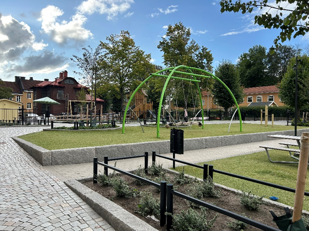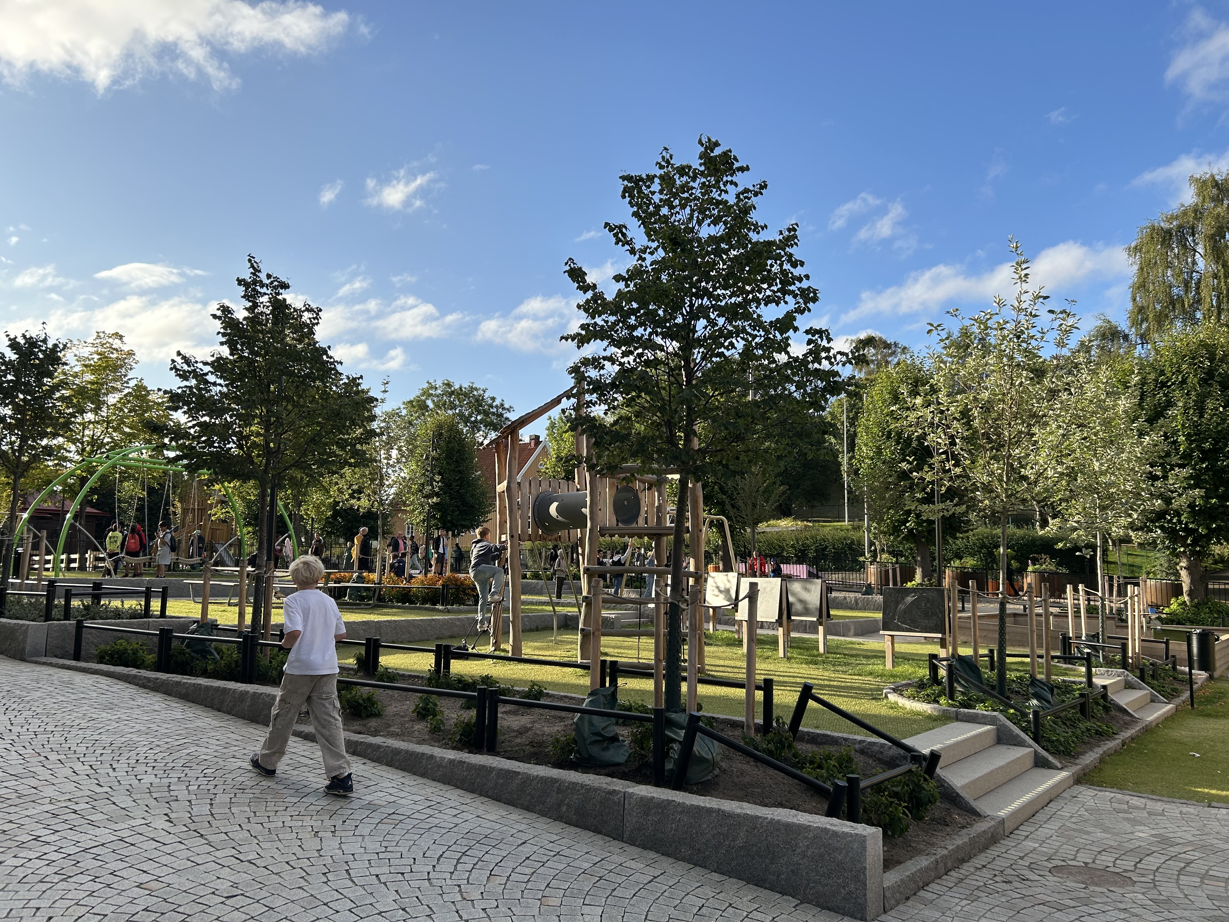 — Och det är så fint att det nu finns mera gröna områden, säger mamman, det finns träd, blommor och buskar som gör skolgården vacker. Nu finns här flera bänkar där barnen kan sitta och prata med varandra.