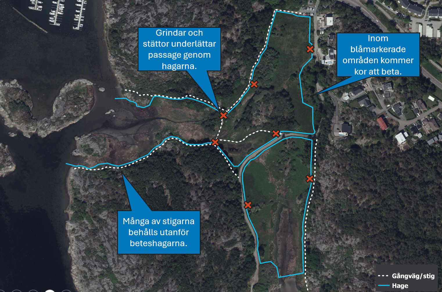 På kartan nedan visas var beteshagarna planeras att ligga och de röda kryssen visar var det kommer att finnas passager för den som vistas och rör sig i området. Placeringen av hagarna och passagerna anpassas efter naturens behov och hur människor rör sig i området.