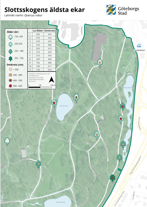 Välkommen att ta en tur genom parken för att uppleva några av Slottsskogens äldsta ekar. Följ kartan för att besöka alla träden och hitta din favorit. Varje träd är markerad med en skylt på plats, för att du lätt ska kunna hitta det.