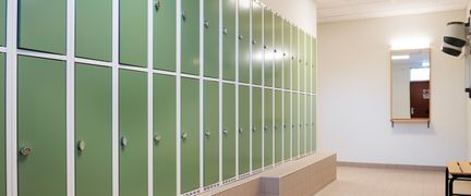 Här finns duschutrymme och skåp där du kan låsa in dina kläder och personliga tillhörigheter. Du behöver ha med eget lås till skåpet.