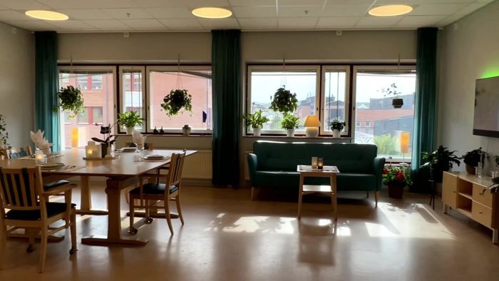 På varje våning finns en gemensam matsal och ett vardagsrum med tv-hörna och bekväma soffor. Inredningen är varm och hemtrevlig och skiljer sig lite från enhet till enhet. På en del platser finns akvarium.