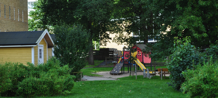 Förskolan är byggd i suterräng i två plan och har en spännande planlösning. Vi har en entrégård på övre plan med sandlåda och lekhus och en större, mer utmanande och lummig gård på nedre plan med klätterställning, gungor och rutschkana.