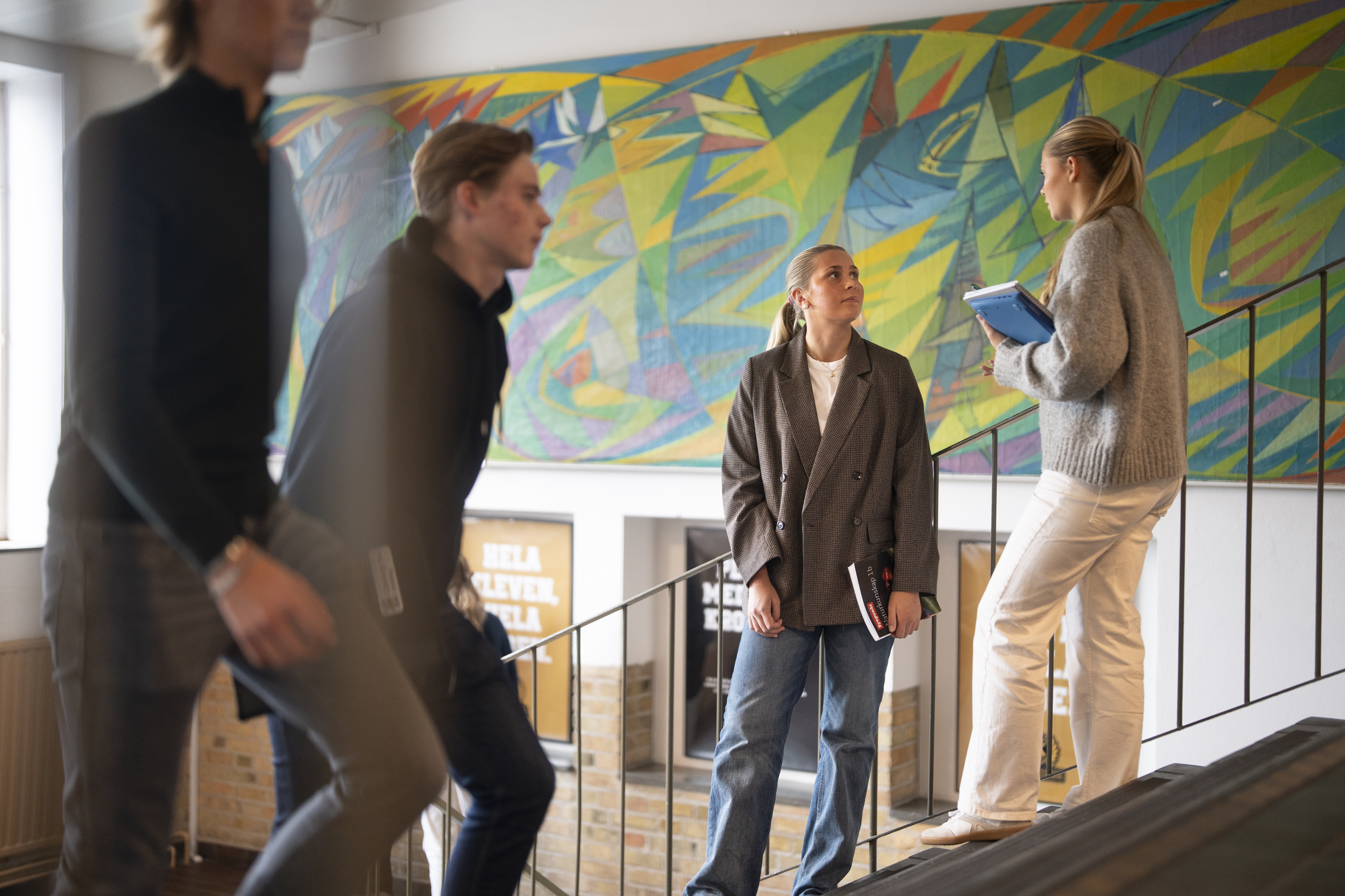 Bild på elever som står och samtalar i skolans trapphus. Foto av Valentin Experience
