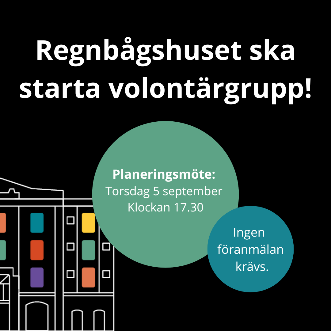 Välkommen till planeringsmöte i Regnbågshuset torsdag 5 september. Planeringsmötet är till för alla som är intresserade av att vara med och utforma Regnbågshusets framtida volontärgrupp.