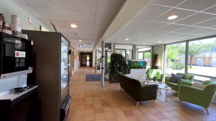 Vid entrén ligger ”glasrummet” här finner ni Omsorgshandledare och administratör. I entrén finns även hiss finns för hyresgäster att röra sig fritt mellan våningsplanen samt för besökare. En våning upp finns en mer öppen yta där musiker uppträder och det går att samlas i lite större grupper, som för sittgympa.