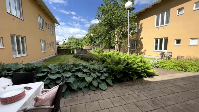 På baksidan har du den gröna innergården och kan slå dig ned vid grillplatsen. Under de varmaste sommardagarna är det skönt att sitta här och svalka sig. Genom innergården går en liten väg till yttergrinden och de fina promenadstråken som ligger runtomkring. Precis intill vårt hus har du Flunsåsparken, som är Sveriges enda folkpark med gratis inträde.