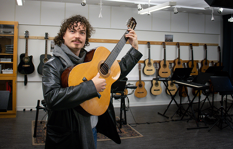 Han har rest runt och spelat mycket, turnerat i hela Sverige, nu senast i ett projekt med en flamenodansare. Men hur hamnade han här? Hur blev det just gitarr?