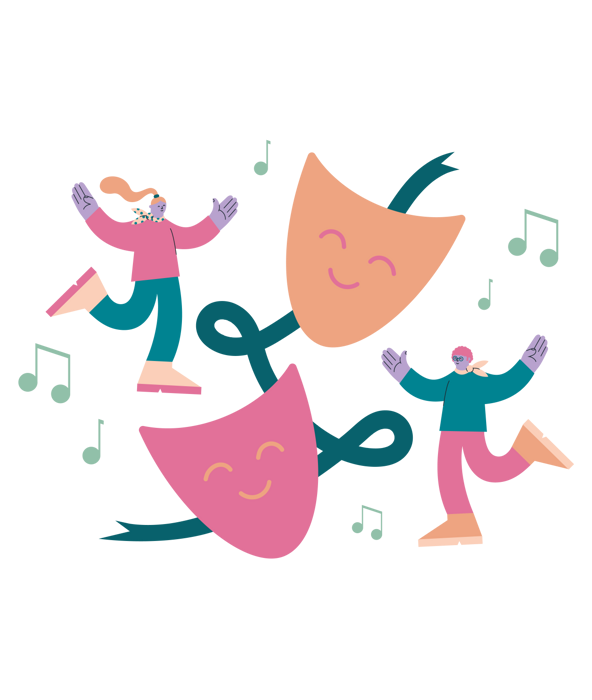 Två personer som dansar bland noter med två glada figurer i mitten av bilden.