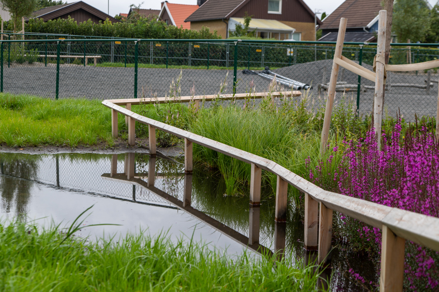 Regnvatten samlas i skyfallsparken i Fjärdingsparken på centrala Hisingen. (Foto: Lina Ekholm)