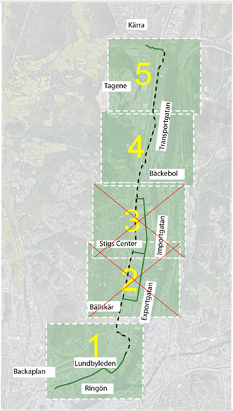Figur 1: Stråkets delsträckor (1) Ringön, (4) Transportgatan södra och (5) Transportgatan norra. Befintliga delar visas som streckad svart linje och delar där åtgärder föreslås visas som heldragen grön linje. Delsträcka (2) Exportgatan och (3) Importgatan har studerats i genomförandestudien men tagits bort ur projektets fortsatta omfattning efter beslut i stadsmiljönämnden 2025-02-07.