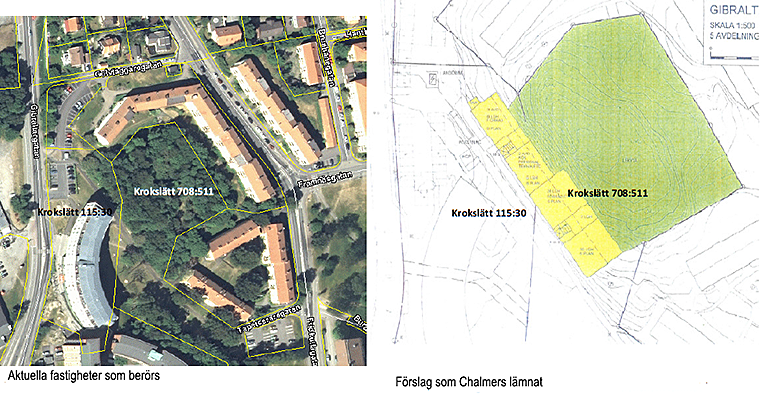 Kommunen har haft en dialog med stiftelsen Chalmers studenthem om möjligheten att placera ett flerbostadshus med både förskole- och bostadsändamål. Intresset från Stiftelsen Chalmers studenthem har varit stort men för att möjliggöra en byggnad krävs också ianspråktagande på delar av Krokslätt 708:511 varför Stiftelsen Chalmers studenthem kommit in med en skrivelse, daterad 2013-01-09, om att begära markanvisning för denna del. Marken används idag som grönyta och är planlagd som allmän platsmark.