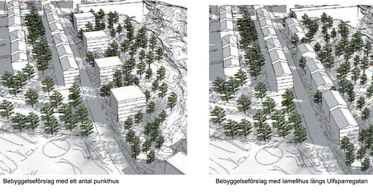 I programarbetet har två förslag på möjlig bebyggelseutveckling presenterats. Dels punkthus som terränganpassas och klättrar upp på berget . I detta förslag möjliggörs fortsatt en tydlig kontakt mellan Ulfsparregatan och grönområdet. Dels lammellhus med långsidorna utmed Ulfsparregatan. Denna struktur knyter an till 40-talsbebyggelsen på andra sidan gatan och ger en annan upplevelse av gaturummet.