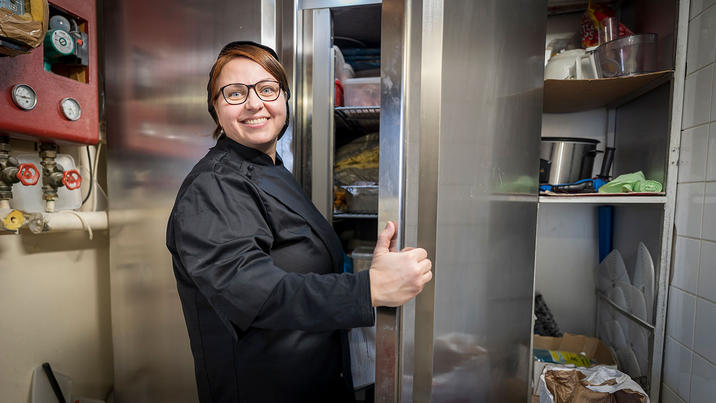 Olga Jakobsson kollar kylarna i ett restaurangkök. Foto: Ulrik Fallström